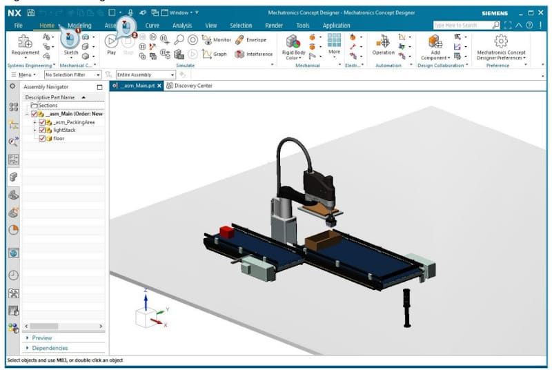 The advanced showcase contains a SCARA kinematics and two conveyors for product / container transportation. The machine is supplied as NX Mechatronics Concept Desinger model. The SIMATIC Motion Interpreter is used to control the machine and implements a conveyor tracking for picking up products, placing them in a container, and applying a container cover.