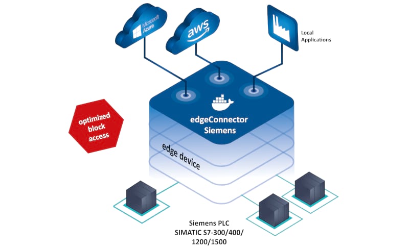 edgeConnector Siemens enables access to SIMATIC S7-1200 and S7-1500 data including optimized data blocks. Version v1.20 additionally supports SIMATIC S7-300/400 controllers. Client applications have access to data via the interoperability standard OPC UA. The product can be configured locally via a built-in web interface, or remotely via a REST interface. It seamlessly integrates with Azure IoT Edge and AWS IoT Greengrass and is made available via online repositories such as Docker Hub.