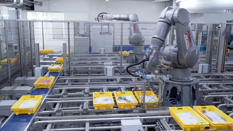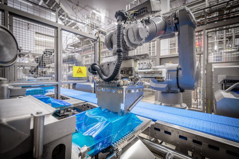 Together with partners in the food industry, Stäubli is working worldwide on the development of robot systems that automate processes in primary and secondary processing. The robots are used for tasks such as cutting, deboning, portioning, packaging and palletizing, as well as for handling unpackaged products or containers with frozen food. When handling soft or fragile foods, the robots demonstrate sensitivity: they grip the products carefully and gently. Even at high work speeds, they ensure consistent product quality.