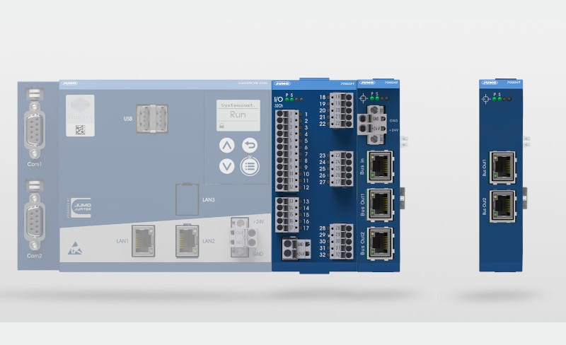 The new 2-port router module extends the central processing unit of the JUMO variTRON by 2 system bus outputs. As a result, the system bus can be transferred to the (equally) new 3-port router module on other DIN rails in the same or in other control cabinets up to 100 m away.