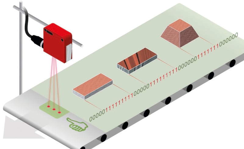 With this approach, the surface properties of the products, such as the colour, gloss, or transparency do not influence the detection. The DRT 25C uses its three light spots to reliably detect the entire spectrum: small, flat, or also tall and spherical products. Even irregular shapes and contours or products with holes are detected thanks to the wide scanning range, these are also detected as a continuous piece.
