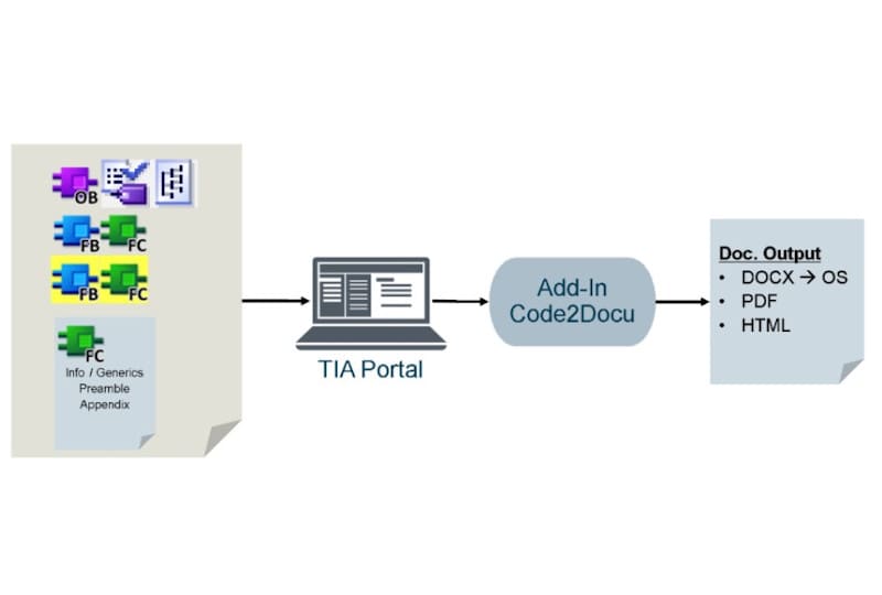 With the help of “Code2Docu” a documentation is generated from functions (FCs), function blocks (FBs) and PLC data types of a TIA Portal project.