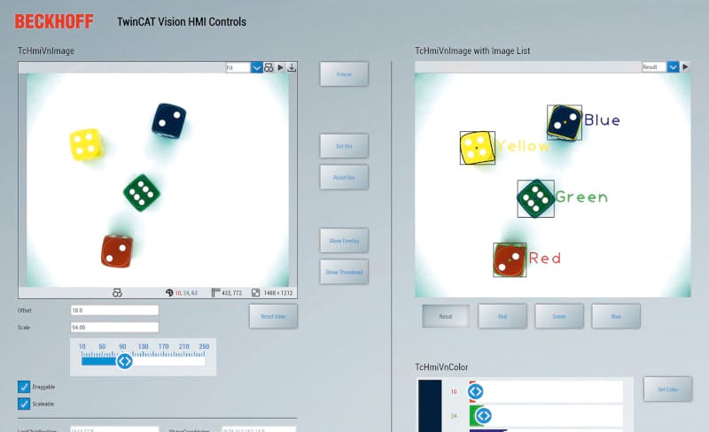 TwinCAT Vision, the Beckhoff image processing solution, offers with the new TwinCAT HMI Control Package the option of integrating image processing into the TwinCAT HMI user interface. This includes an expanded image display control and a color control.