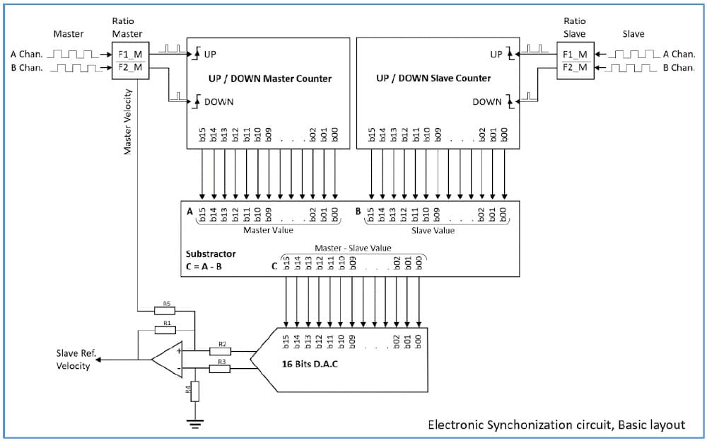 The following error result is converted to a speed reference value of ±10V by a DAC, digital analog converter, this value is added to the theoretical speed value of the Master axis, and the result is the speed of the Slave axis.