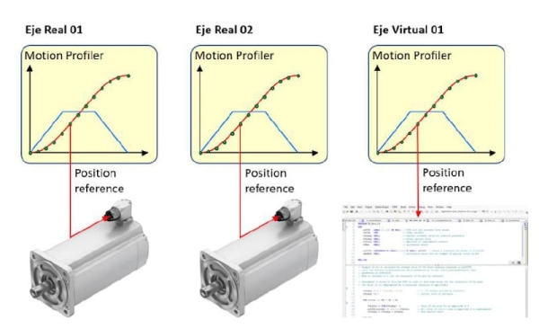 In complex machines with a large number of axes, one or several virtual axes are usually used as “Master” and are synchronized, by means of electronic cams -CAM Profiles- with as many real “Slave” axes as necessary depending on the application.
