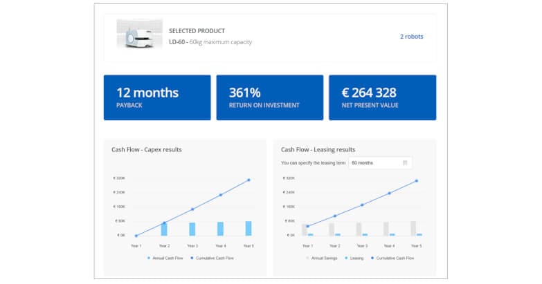 A key decision for the customer is how to finance a new investment. The ROI calculator from OMRON gives two typical options: the traditional Capex option with full payment at the beginning and an Opex option with leasing, with payments spread between 3-5 years.
