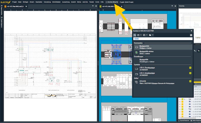 In the current WSCAD ELECTRIX release, the quick search “Search & Click” will be visible for the first time – it will be celebrating its premiere at the SPS. Thanks to the new function, users no longer have to worry about where to find a certain functionality for creating their electrical engineering documents. All you have to do is enter a term in the search dialog – matching hits will be displayed. The highlight: Nobody has to leave the drawing area, for example to execute a command from the menu bar or to place a symbol on the plan. A new project can be created using the quick search, as can mounting plates, cable ducts and top-hat rails on cabinet pages. Software settings can also be changed quickly and easily with Search & Click.